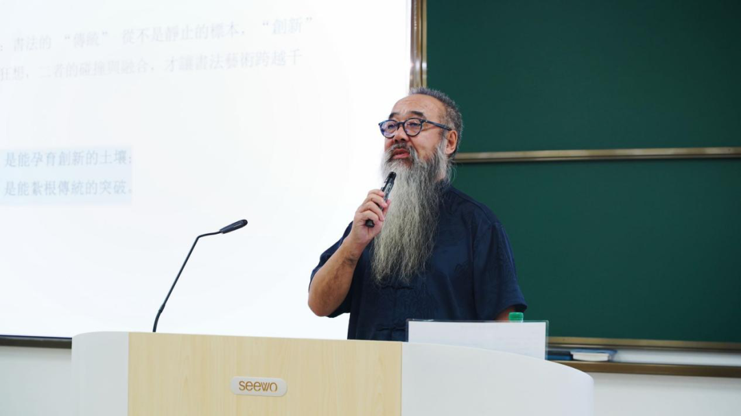 谈及 “书法传播的‘当代密码’”,尹大玮教授聚焦数字时代的传播新策略,提出传统与创新的 “对话共生” 理念。他以徐冰的跨界创作、井上有一的情感化表达为例,说明书法创新需扎根传统根基,在形式、载体、解读方式上寻求突破。通过解析王羲之《兰亭集序》、颜真卿《祭侄文稿》、苏东坡《寒食帖》等经典作品,他指出,书法传统并非静止的标本,创新也非无根的狂想,两者的碰撞融合才能让书法艺术跨越千年仍充满活力。