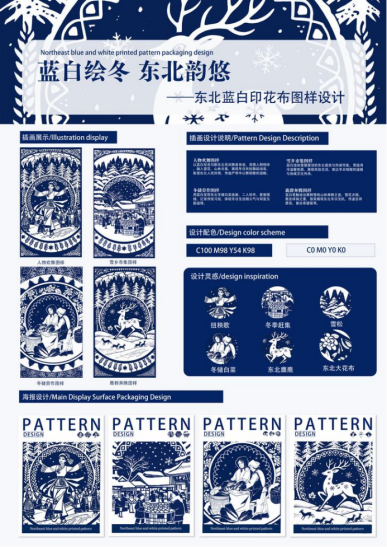 卢芯贤,林钰滢,刘温童,刘泳欣 《蓝白绘冬,东北韵悠——东北蓝白印花布图样设计》节选 一等奖
