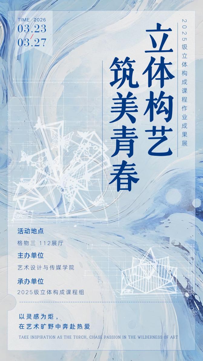 为夯实艺术设计学专业基础教学,展示课程教学成果,丰富校园文化艺术氛围,由艺术设计与传媒学院主办、2025级立体构成课程组承办的立体构成课程作业成果展,于2026年3月23日至3月27日在格物三112展厅顺利举办。本次展览面向全院师生开放,集中展出优秀学生作品29份,吸引了众多师生驻足观展、交流学习,获得广泛好评。
