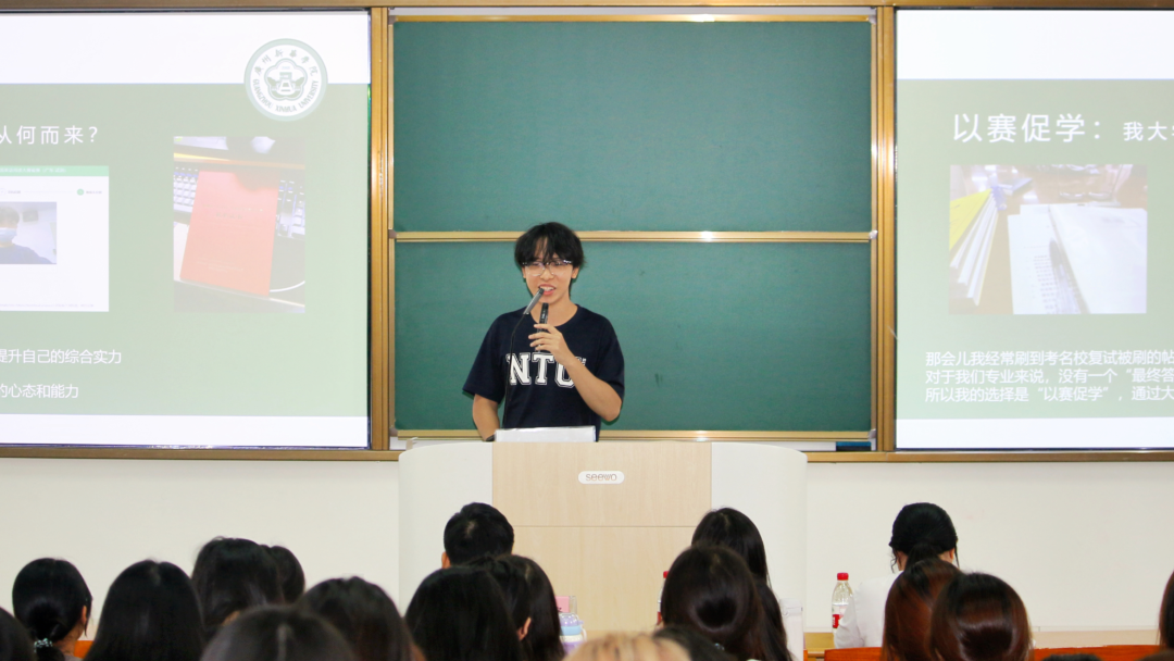 在分享会上,苏昊蓝学长结合自身从迷茫到坚定走上考研的成长经历,向大一新生们分享了如何在大学阶段通过个人兴趣、个人能力、社会需求和情感支撑来寻找自身目标,并最终实现自我突破的心路历程。此外,苏昊蓝学长还向在场的同学们介绍了自己如何运用“坐标法”和“回溯法”来制定适合自己的奋斗方向与目标。