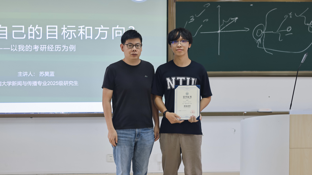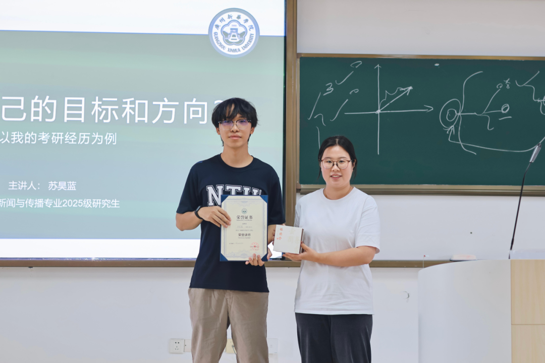 恰逢广州新华学院建校20周年校庆之际,艺术设计与传媒学院特别策划了优秀校友返校活动,为新生分享个人杰出经历。本次“学子讲坛”特邀我校2021级网络与新媒体专业的优秀毕业生、现就读于暨南大学新闻与传播专业计算传播方向研究生的苏昊蓝学长担任主讲嘉宾。苏昊蓝学长以“如何在大学期间找到自己的方向和目标?——以我的考研经历为例”为主题,与在校学子展开深入交流。