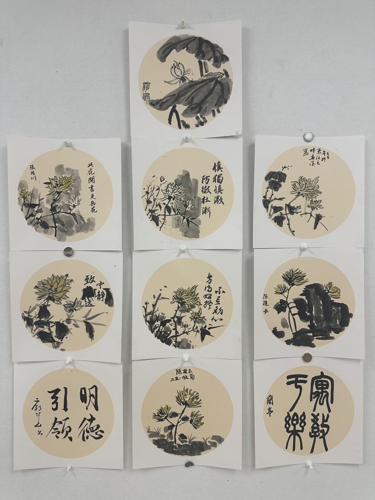 在绘画上,邓春润老师悉心点拨,同志们围绕“菊花”主题展开创作。画笔下,或见秋菊傲霜,挺拔而立,喻示坚贞不屈的风骨与高洁;或勾勒丛菊烂漫,清气满纸,寄托淡泊明志的追求。亦有同志以莲花出水象征清廉,泼墨山河抒写爱国情怀。画笔流转间,对党的忠诚、对作风建设的支持、对美好生活的向往,尽数融入这描绘菊韵的尺素方寸之中。
