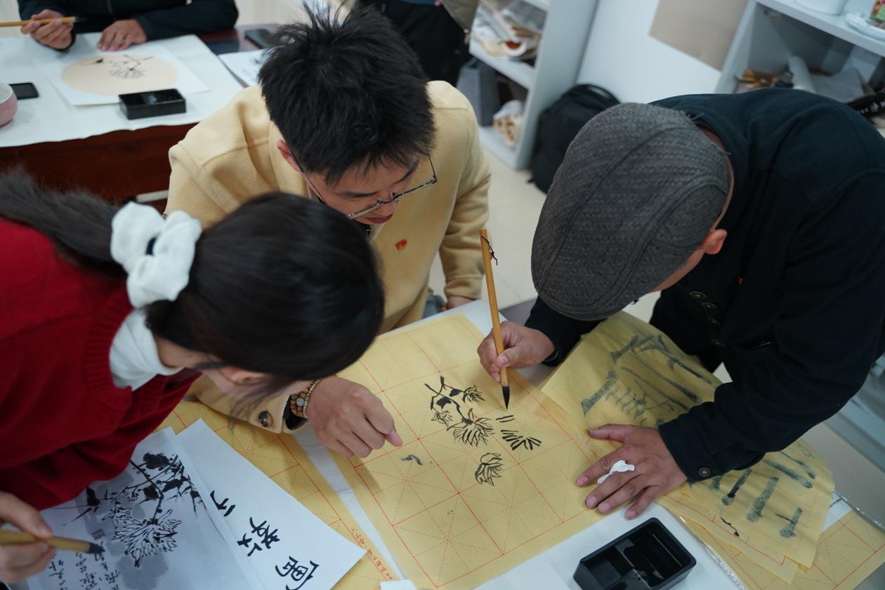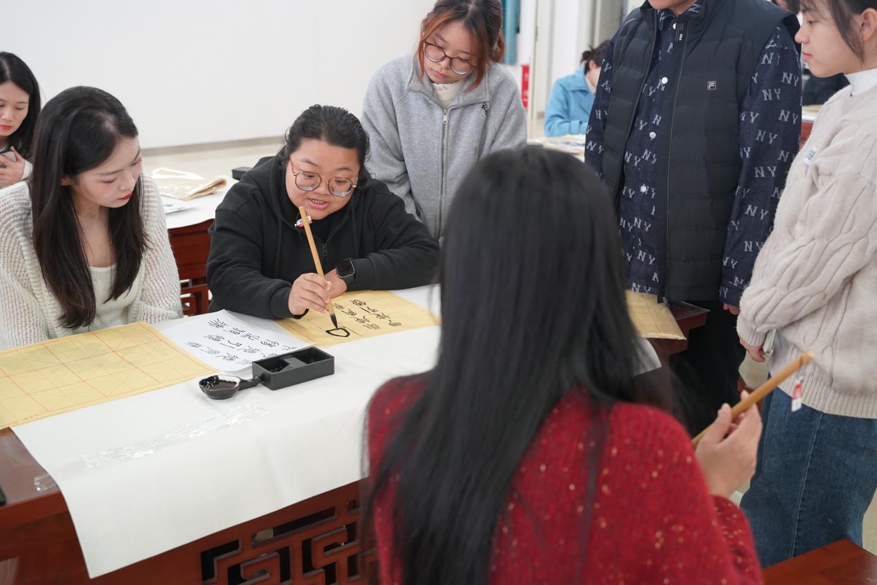 一时间,教室转换为充满雅趣的艺术创作空间。在书法方面,由汪兰婷老师主讲,靳继君教授、李庙华老师两位老师协助指导,书法学专业的同学们从旁协助、分发物资。党员同志们凝神静气,提笔挥毫,一个个苍劲有力或清秀雅致的字迹跃然纸上,“清风正气”“不忘初心”“廉以养德”书写的是汉字,凝聚的是信仰。