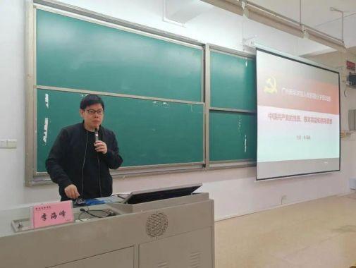 艺术设计与传媒学院党总支副书记李海峰老师以“中国共产党的性质、宗旨和指导思想”为题授课,结合中国共产党的发展历程,重点阐述党的性质、“全心全意为人民服务”的宗旨以及马克思主义中国化时代化成果,并引导学员们深刻领会中国共产党“为中国人民谋幸福,为中华民族谋复兴”的初心和使命。